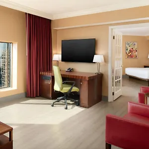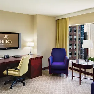 The 4-star Hilton Charlotte Uptown boasts elegant rooms with a modern and comfortable atmosphere. The spacious guestrooms feature mappable hardwood floors, walk-in showers, and the latest technologies such as flat-screen TVs with satellite channels. All rooms are equipped with premium bedding, laptop-compatible safes, and thoughtful touches like laptop-friendly workspaces and air conditioning. Some rooms offer the added convenience of a refrigerator, microwave, and a pillow-top mattress. Guests can also enjoy dining amenities in the form of coffee/tea makers and a seating area in select rooms.